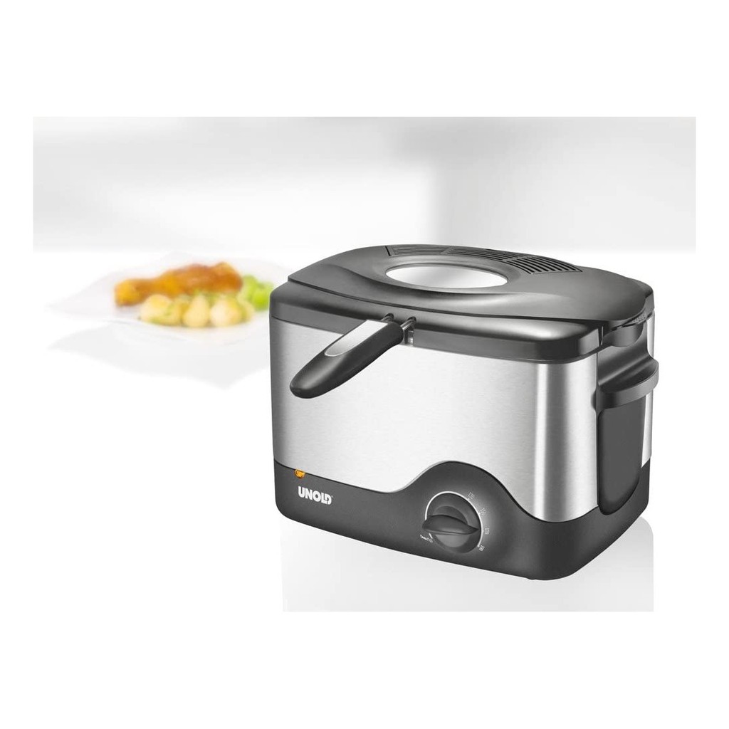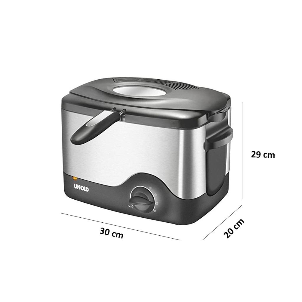 Nồi chiên ngập dầu UNOLD có thiết kế vỏ thép không gỉ cách nhiệt, cảm ứng mát của DEEP FRYER Compact.Tất cả các món chả giò, chả cá hay đồ nướng, chẳng hạn như bánh rán và táo chiên trở thành những món ngon giòn trong DEEP FRYER Compact. Hộp chứa của nồi chiên chứa khoảng. 1.5 lít dầu và có thể dễ dàng tháo rời để vệ sinh, giống như giỏ của nồi chiên.
