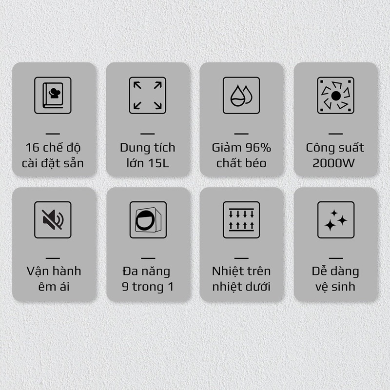 👉 Cung cấp tới 16 chức năng cảm ứng đã cài đặt sẵn thời gian và nhiệt độ theo từng món ăn: Gà quay, rã đông, cánh gà, sấy khô, bít tết, khoai tây chiên, cá nướng, rau củ, bỏng ngô, lên men, bánh, xiên nướng, pizza , giữ ấm, bánh mì, bánh quy giúp bạn nấu được đa dạng món ăn vô cùng hấp dẫn.