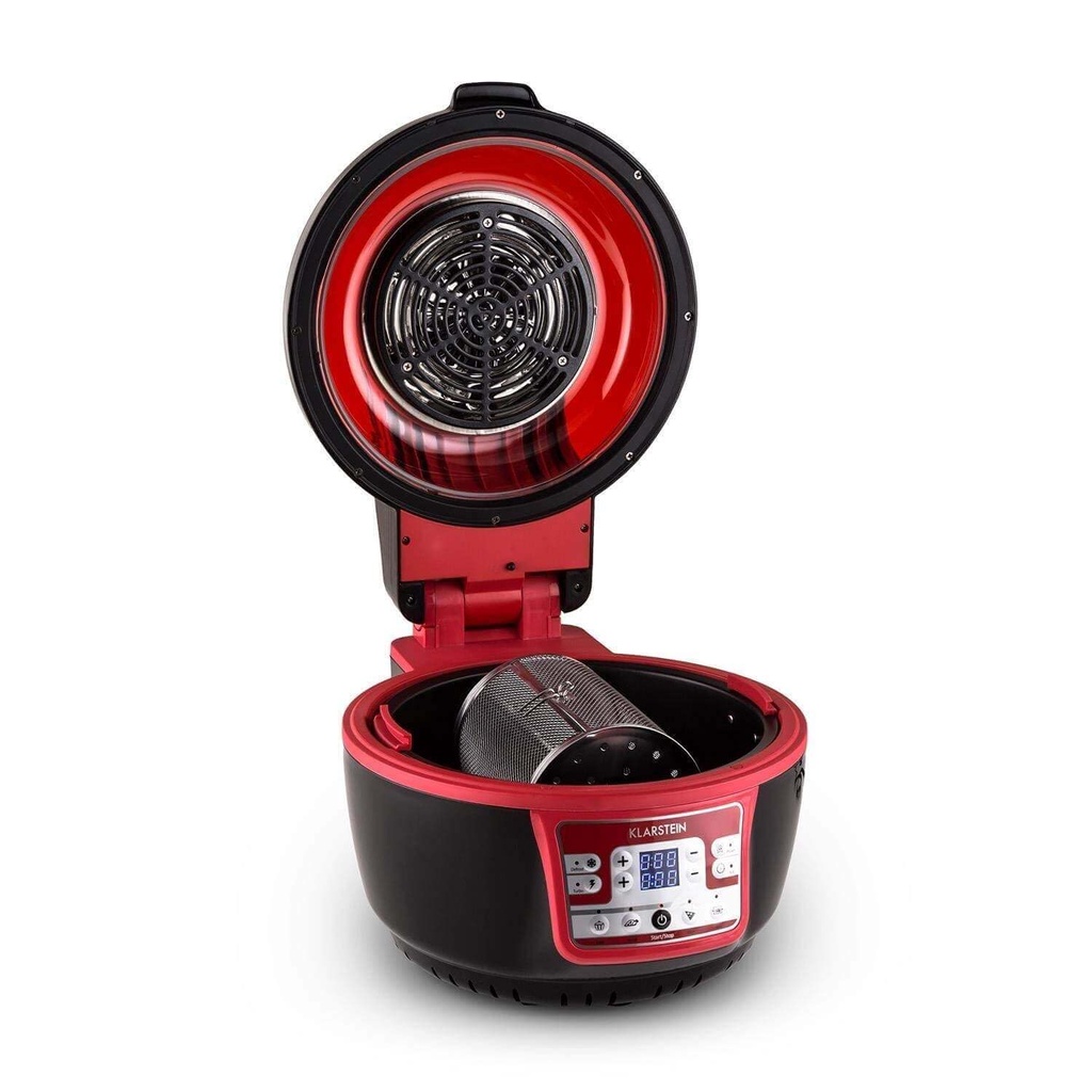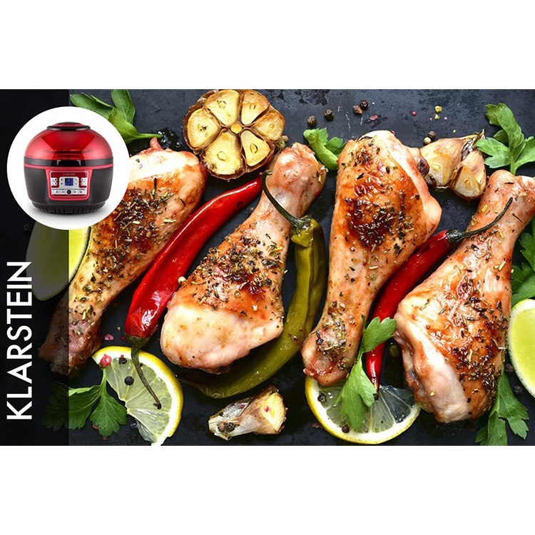 Nồi chiên rán Klarstein được thiết lập với 8 chương trình cài đặt sẵn: Chương trình nhanh, chiên gà - cá - thịt - BBQ, nướng trong lòng (khoai tây chiên), Baking, Pizza, Steak, xiên, chuyển các chức năng quay. Người dùng có thể chọn 1 trong các chức năng này, sau đó chọn thời gian và nhiệt độ. Với bảng điều khiển chuyển xuống thân nồi thay cho trên nắp nồi (khu vực tạo khí nóng), giúp tạo sự thẩm mỹ cho sản phẩm và màn hình LCD độ phân giải cao.