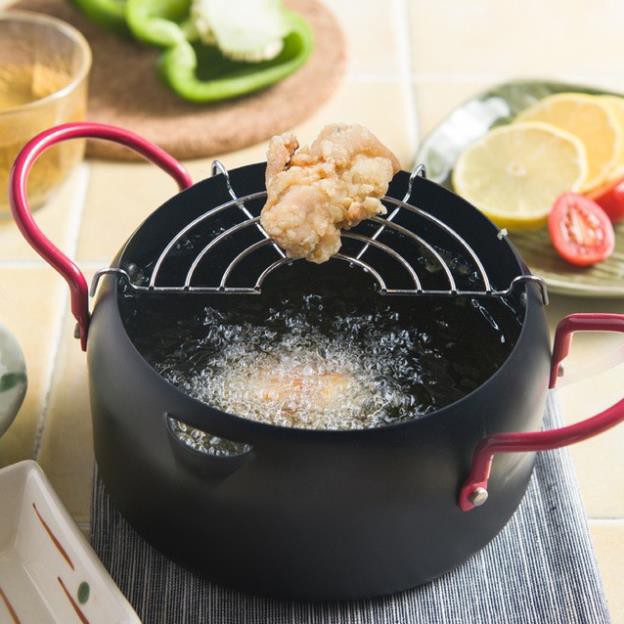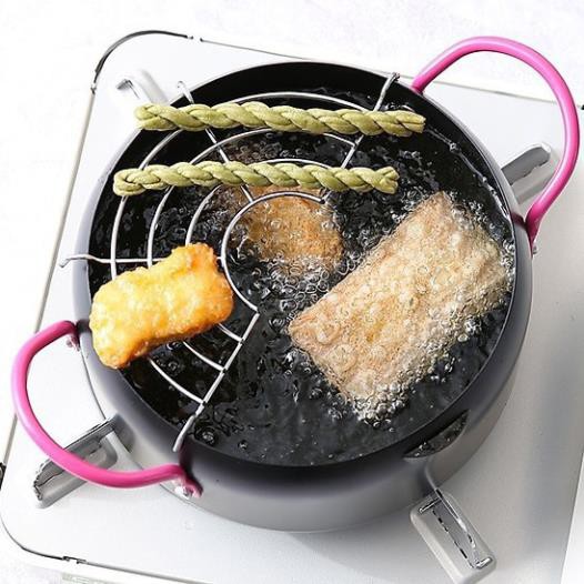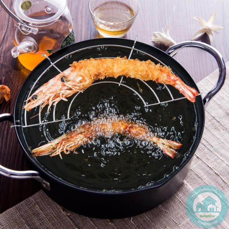 Nồi chiên xuất nhật: dày dặn, chống dính, k bị tốn dầu, chống bắn dầu mỡ , kèm thêm vỉ gác mỡ.