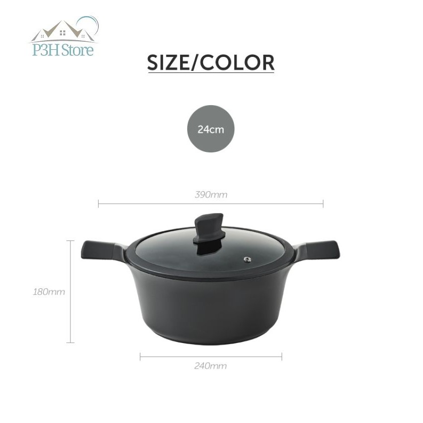 Size 24cm : đường kính nồi 24cm, cao 18cm, tổng chiều dài 39cm tính luôn 2 cán