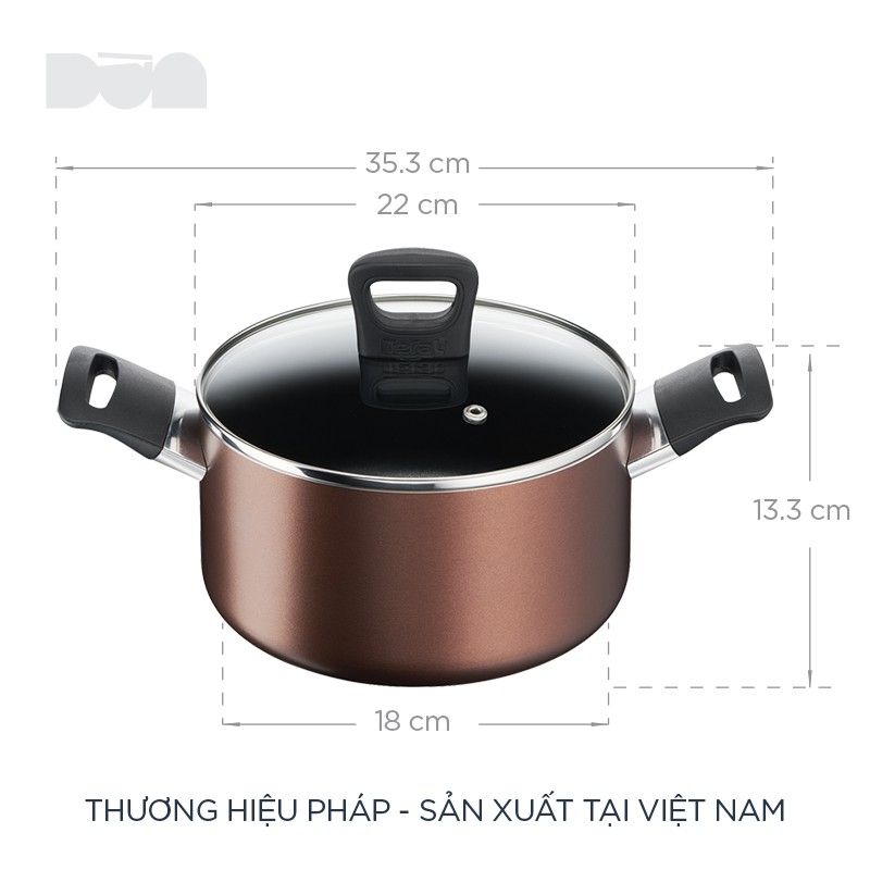 [Xin chào các bạn đến với trang bán hàng của Nhasachngoncom.vn, hôm nay Dừa muốn giới thiệu đến các bạn dòng sản phẩm của thương hiệu Tefal]- Nồi chống dính hợp kim nhôm đường kính 22cm phủ lớp titanium-reinforced, vừa chống dính vừa an toàn cho sức khỏe. Đặc điểm chung của nồi nhôm so với nồi sứ hay inox là phân bổ nhiệt đều, nấu chín thức ăn nhanh (đỡ hao điện hao gas :)). Titanium thì tốt khỏi nói rồi, nhưng hợp kim titanium có cái gì trong đó thì do uy tín của nhà sản xuất.
