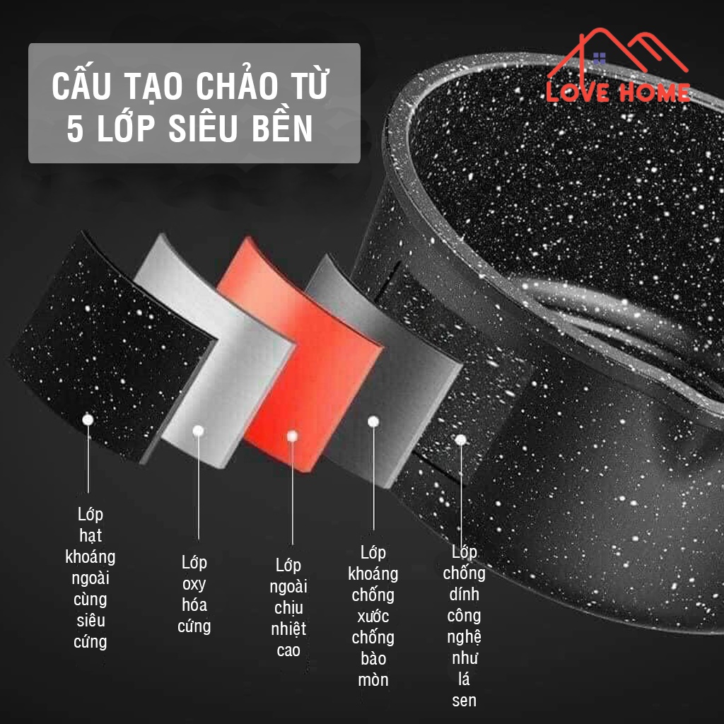 - Chảo vân đá chống dính cấu tạo từ nhôm cao cấp không rỉ giúp toả nhiệt đều và nóng nhanh hơn