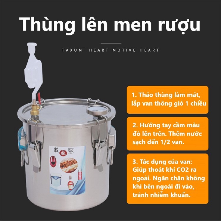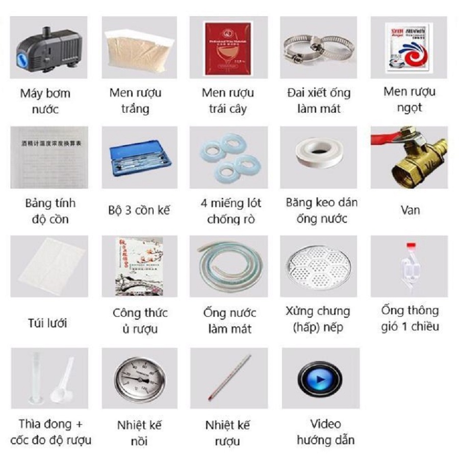 - 1 thùng inox chứa nước làm mát + 1 ống inox xoắn ngưng tụ + 1 ống inox hứng + 4 miếng lót chống rò