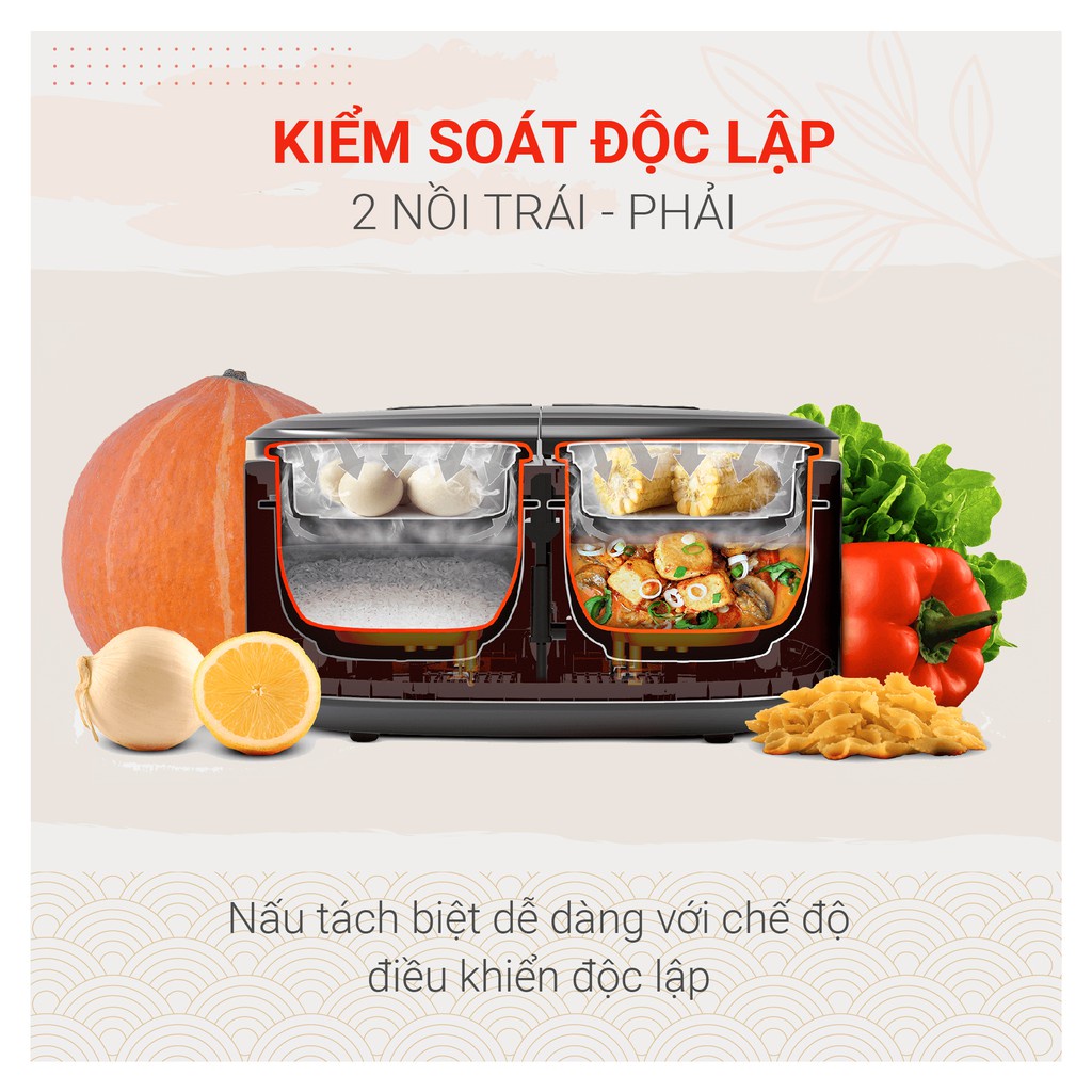 • Nấu được cùng lúc 4 món nhờ thiết kế 2 nồi, kèm 2 xửng hấp.