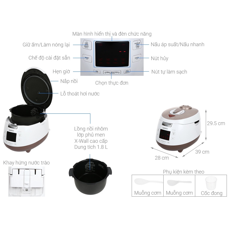 - Các chức năng chính: Hẹn giờ, ủ cơm, báo thời gian cơm chín, nắp xả hơi tản, khóa an toàn.