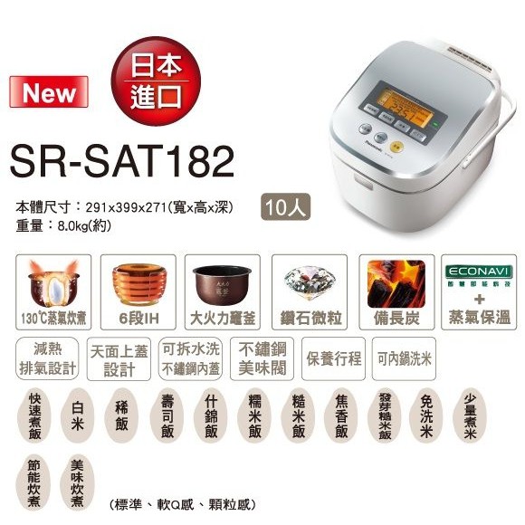 NỒI CƠM CAO TẦN 1,8 LÍT PANASONIC E-SRSAT182Cơm ngon là yếu tố tạo ra những bữa ăn ngon tại Nhật, và một trong những yếu tố làm nên bữa ăn ngon chính là những chiếc nồi cơm điện hiệu suất cao. Tại Nhật Bản bạn có thể bắt gặp rất nhiều những thương hiệu nồi cơm điện chất lượng như Tiger,Panasonic, Zojirushi, Toshiba, hay Hitachi. Không chỉ giúp nấu cơm ngon tại Nhật mà ngay cả khi bạn đem những chiếc nồi này về nước bạn cũng có thể nấu những bữa cơm ngon cho chính gia đình mình.