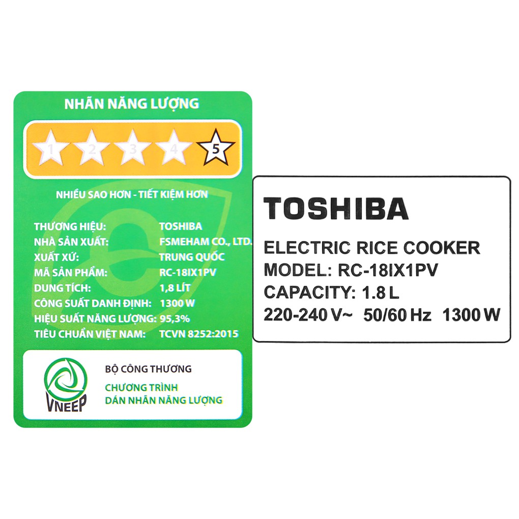Thông số kỹ thuật Nồi cơm cao tần Toshiba 1.8 lít RC-18IX1PV