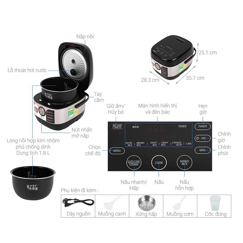 Nồi cơm có các chức năng như white rice (nấu cơm), sticky rice (xôi), quick/steam (nấu nhanh/hấp), crispy rice (nấu cơm cháy), brown rice (gạo lứt), congee/soup (cháo/súp), cake (làm bánh), mixed rice (trộn cơm).