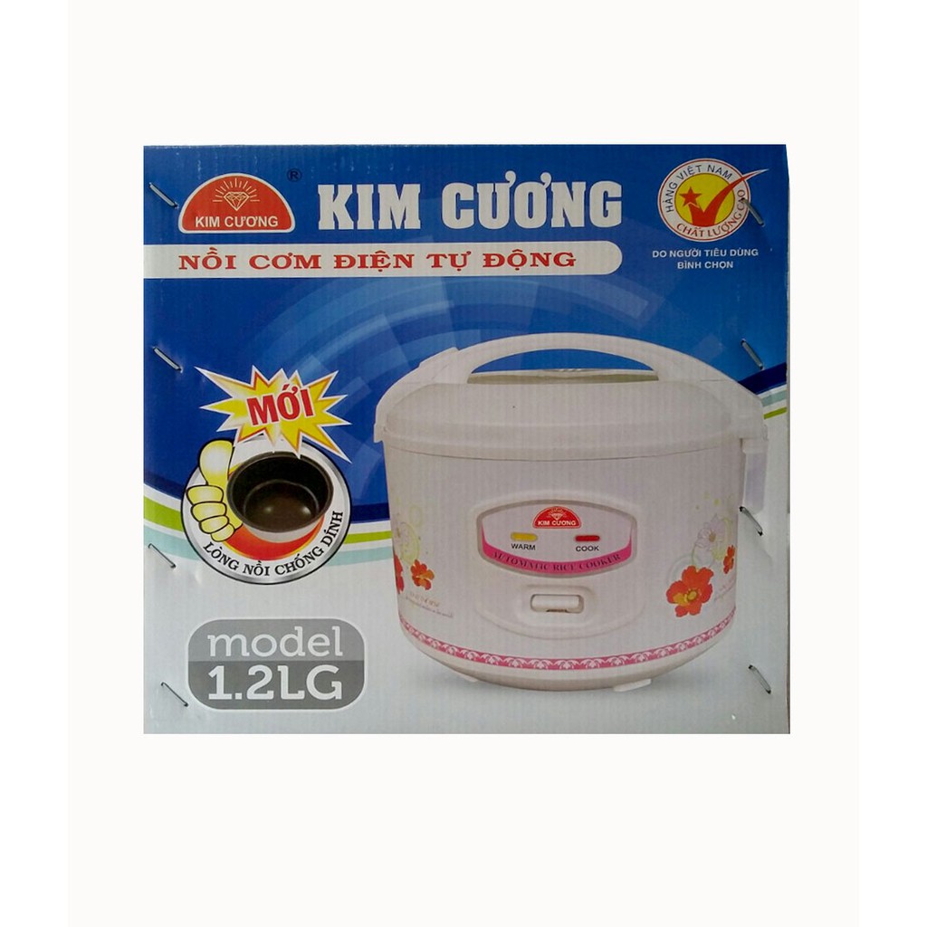 Thông tin vê Nồi cơm điện 1.2L Kim Cương KC1.2LGCD:- Nồi cơm điện Kim Cương 1.2 lít nắp gài là mẫu nồi cơm có thiết kế ấn tượng và có men chống dính 2017, sản phẩm sản xuất theo công nghệ chống dính của Hàn Quốc, giúp cơm chín vừa để giữ lại các nguyên tố dinh dưỡng có trong cơm. Ngoài ra giúp nồi cơm sử dụng bền hơn theo năm tháng so với phiên bản củ.