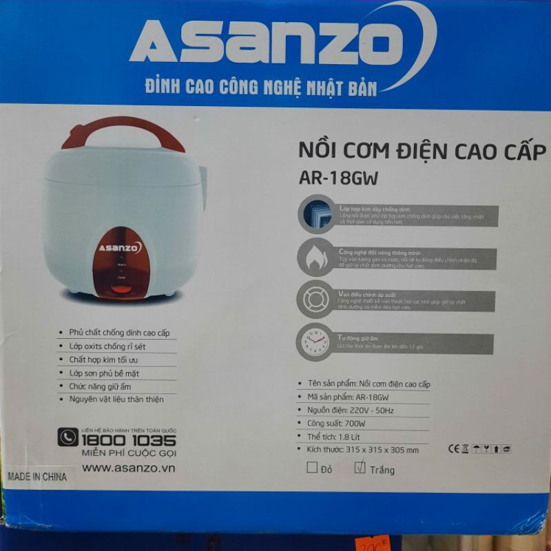 NỒI CƠM ĐIỆN 1,8 LÍT ASANZO THIẾT KẾ LÒNG NIÊU TRÁNG MEN ( model : AR - 18GW )