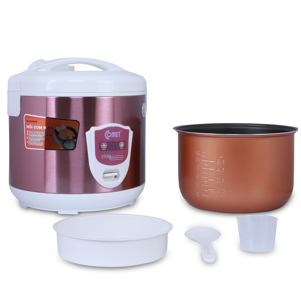 - Nồi cơm điện 1.8 lít Comet CM8058P-Tím mận thuộc dòng nồi cơm điện nắp gài, liền với thân dưới được ưa chuộng trong các ngôi nhà hiện đại. Sản phẩm nhỏ gọn với chiều ngang chỉ 28cm, mẫu mã lạ mắt nhờ màu tím sáng bóng mang lại sự sang trọng cho không gian căn bếp ngôi nhà bạn.