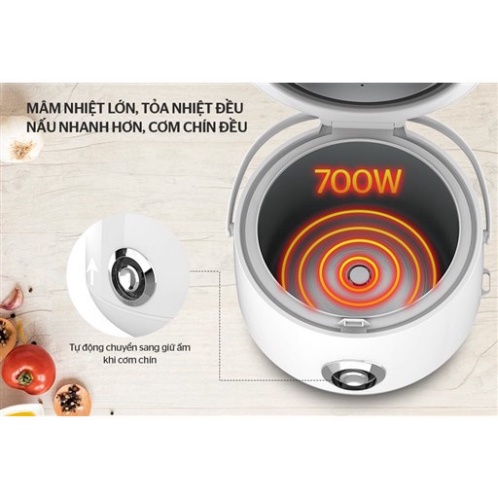 - Công suất 700W, đường kính mâm nhiệt lớn, tỏa nhiệt đều, cơm chín đều và ngon hơn.