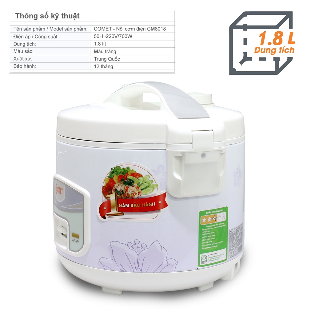 - Nồi cơm điện Comet CM8018 thiết kế sang trọng và hiện đại mang đến cho gia đình bạn những bữa cơm đầm ấm.