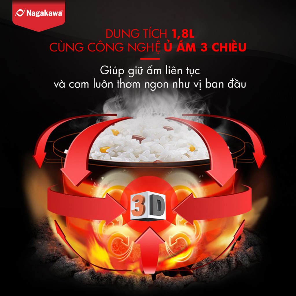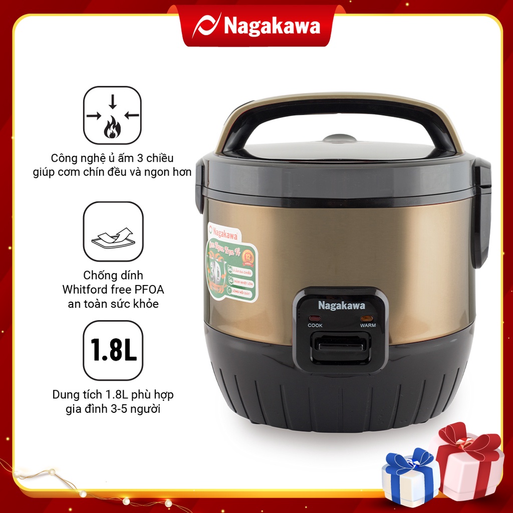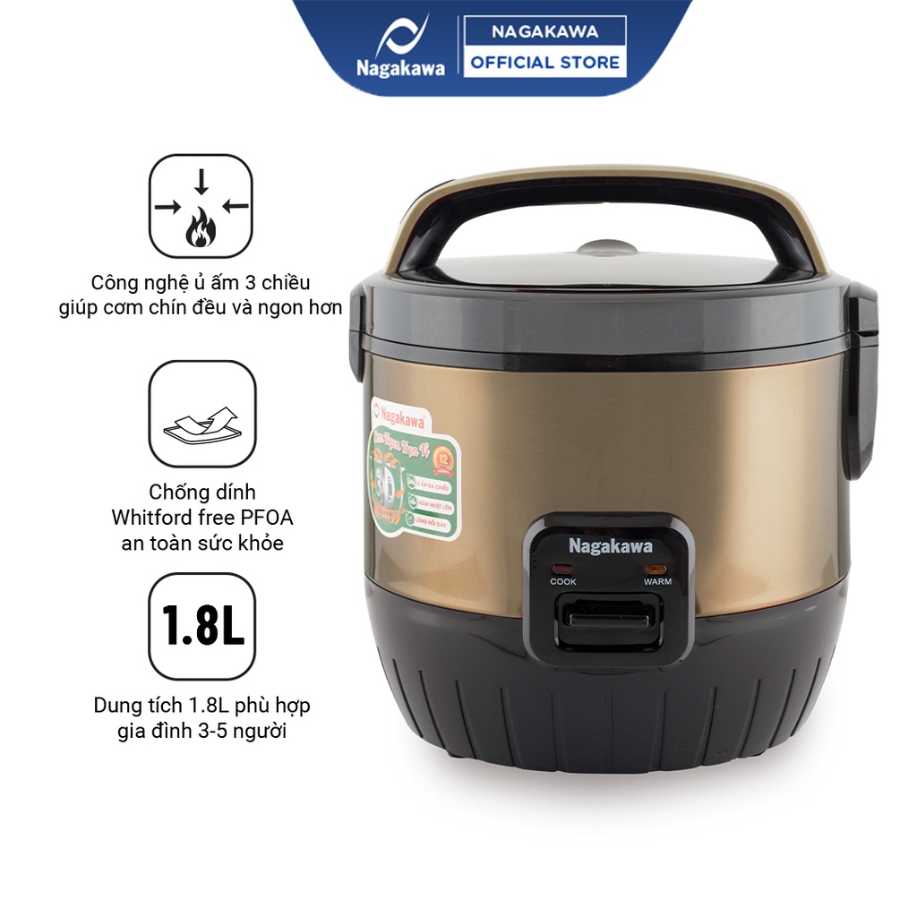 Giới thiệu chi tiết sản phẩm : Nồi cơm điện 1.8L Nagakawa NAG0119(vàng)✔️Công nghệ ủ ấm ba chiều, giữ nguyên hương vị