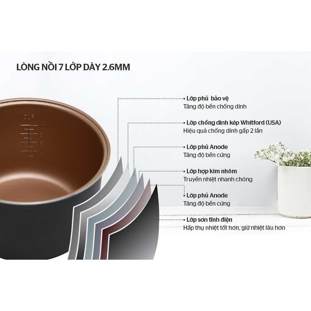 Lòng nồi được cấu thành từ 7 lớp vật liệu và dày tới tận 2.6mm, trong đó có 2 lớp phủ anode – đây là chất liệu có độ bền cứng rất cao, hạn chế móp méo nếu chẳng may xảy ra va đập. Lòng nồi cơm điện càng dày thì càng giữ nhiệt tốt hơn, cơm ngon lâu hơn, hương vị được giữ trọn vẹn.