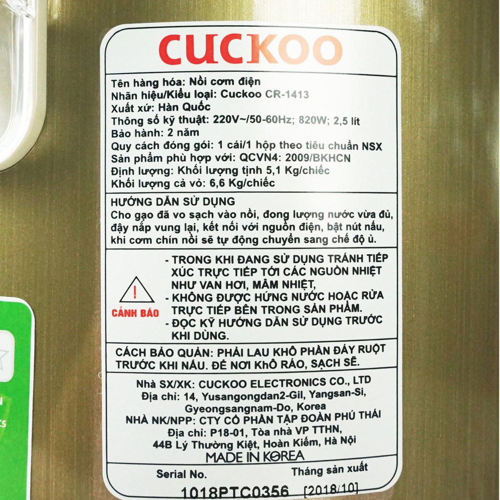 [Mã ELHADEV giảm 4% đơn 300K] Nồi cơm điện 2.5 lít Cuckoo CR-1413 nhập khẩu Hàn Quốc chính hãng bảo hành toàn quốc