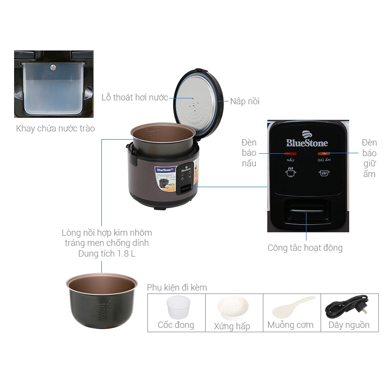 Thông số kỹ thuật Nồi cơm điện Bluestone 1.8 lít RCB-5520Loại nồi: Nồi cơm nắp gài