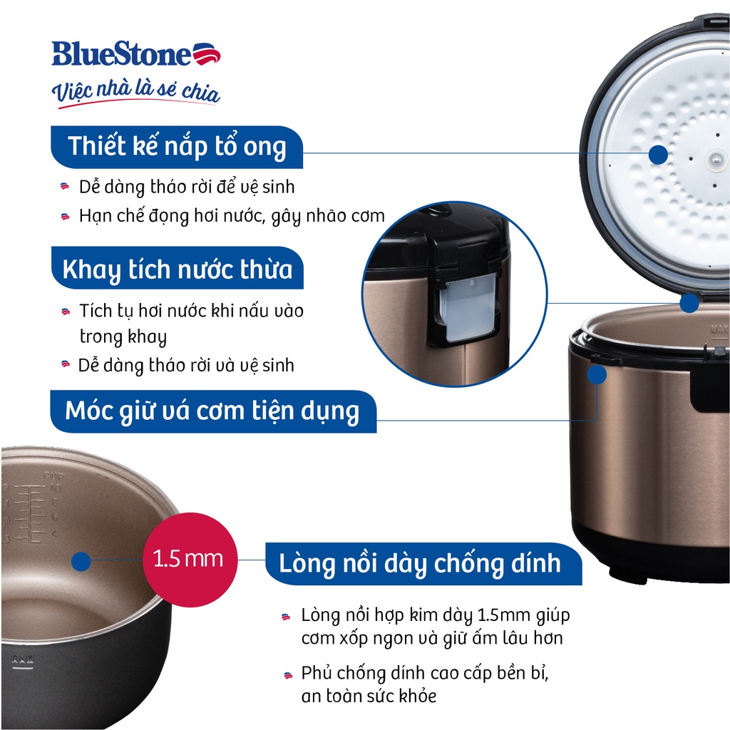 Nồi cơm nắp gài BlueStone với thiết kế sang trọng, tích hợp nhiều ưu điểm nổi bật, mang đến những bữa cơm thơm ngon cho gia đình Việt.