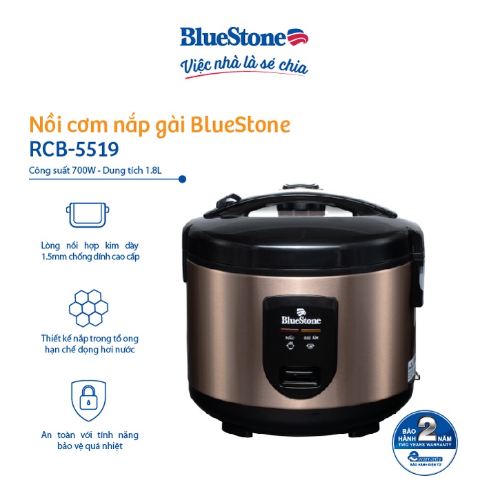 Với kiểu dáng hiện đại, trang nhã, chức năng đa dạng, nồi cơm nắp gài BlueStone RCB-5519 là sự lựa chọn hoàn hảo cho bữa cơm gia đình.