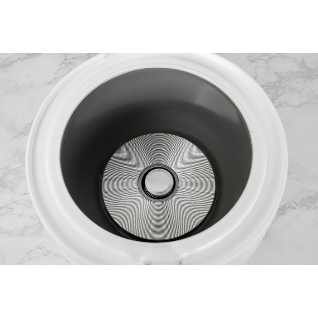 Nồi cơm điện nổi bật với sắc trắng sang trọng, cùng thiết kế bo tròn lạ mắt nhỏ gọn tiện lợi, độc đáo.