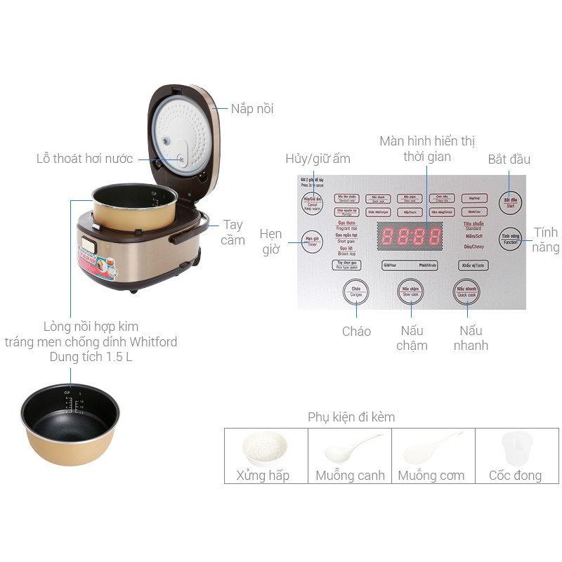 Chức năng nấu:Nấu cơm, Nấu cơm ngon, Nấu cháo, Nấu chậm, Hấp