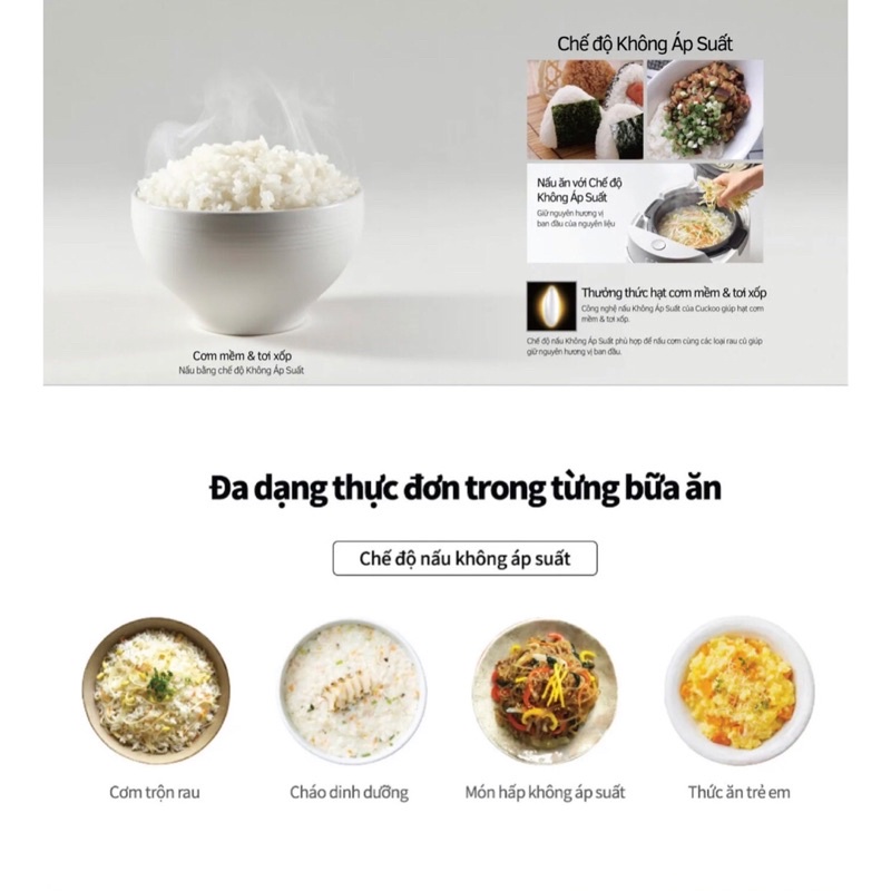 Chế độ nấu không áp suất: cơm tơi xốp, món hầm chín tới, nấu các món cháo, ăn dặm và open cooking