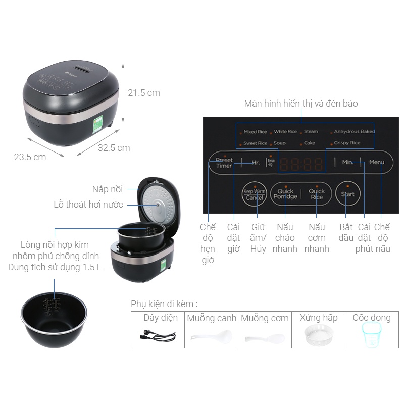 Menu nấu: Cơm trắng/Nấu cơm nhanh/Nấu cháo nhanh/Cơm gạo nếp/Cơm cuộn/Cơm cháy/Cháo trắng/Cháo đặc/Súp/Hấp/Om thịt khô