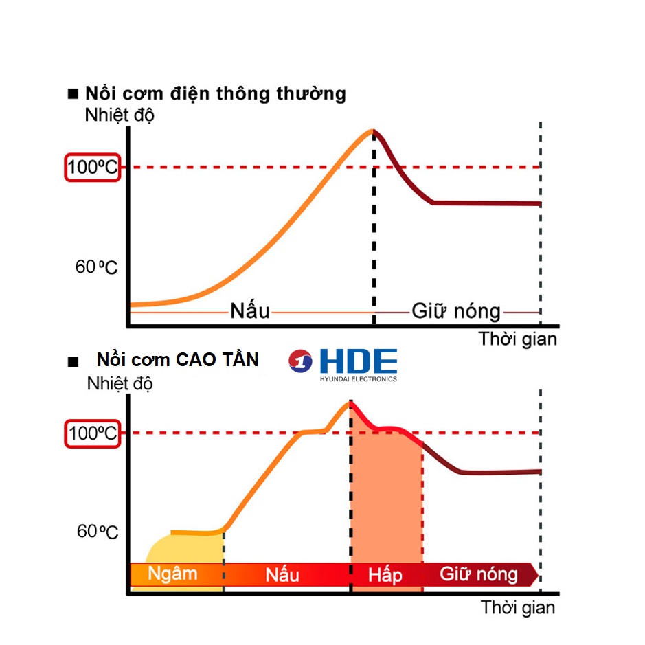 - Nồi cơm điện cao tần Hyundai HDE 2200 sử dụng công nghệ IH (Induction Heating) - Công nghệ đốt nóng nhờ cảm ứng điện từ cung cấp nhiệt mạnh mẽ và đồng bộ khắp nồi làm cơm chín đều, thơm ngon hơn mà vẫn giữ nguyên chất dinh dưỡng.