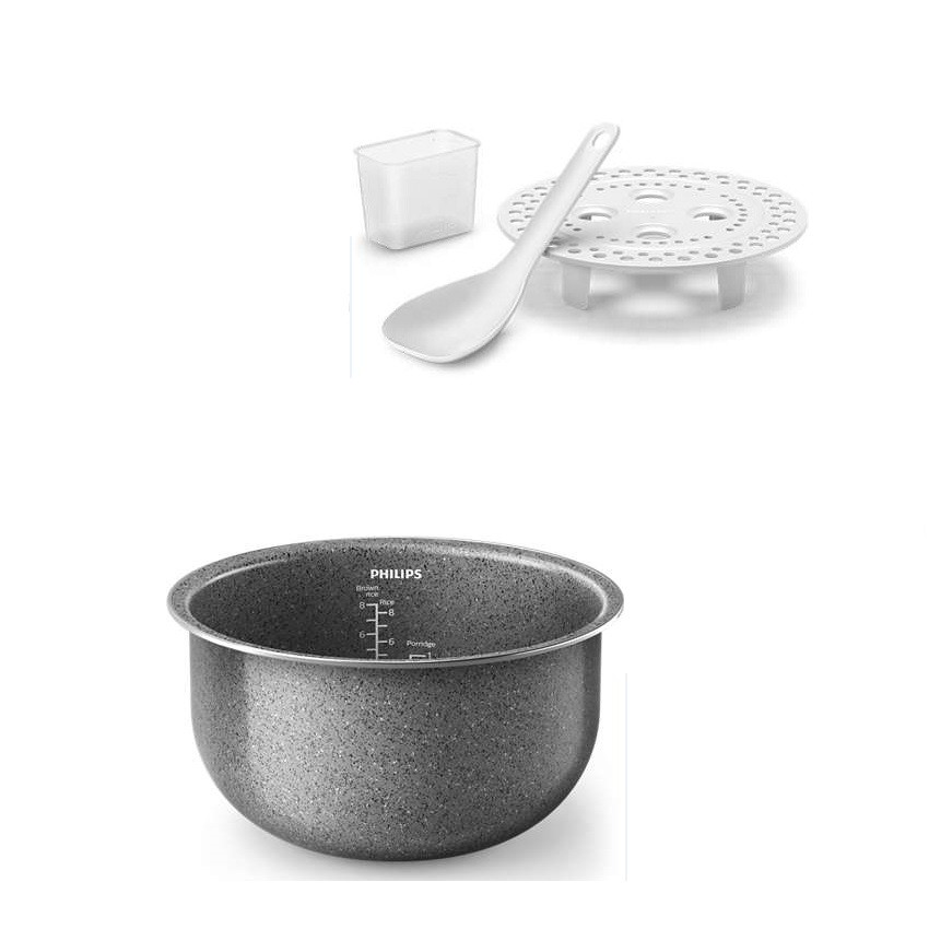 Nồi cơm điện cao tần Philips HD4528/66 kèm theo các phụ kiện bao gồm cốc đong, muỗng cơm. Đặc biệt, có xửng hấp đi kèm tiện lợi cho các món hấp hay món bánh đơn giản.