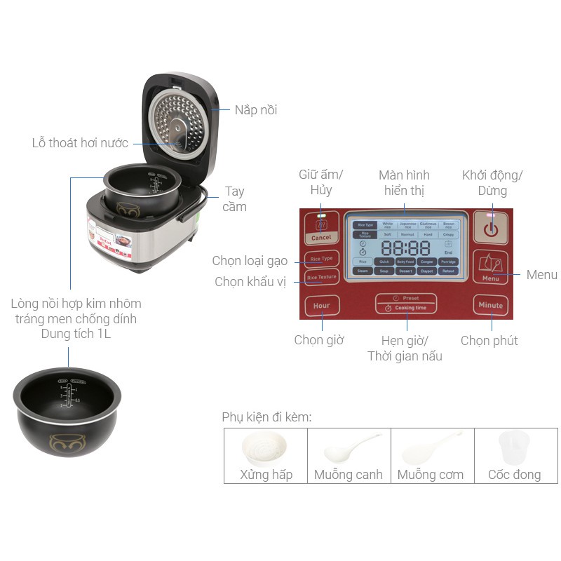 Chức năng nấu: Nấu cơm, Hâm nóng, Nấu cháo, Nấu chậm, Nấu cơm trộn, Nấu ít cơm, Nấu nhanh, Nấu gạo lứt, Làm bánh