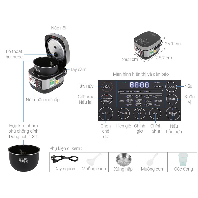 òng nồi hợp kim nhôm chống dính bằng bột than Binchotan Nhật Bản an toàn khi nấu, dễ vệ sinh.13 chức năng nấu đa dạng và tiện lợi: nấu cháo, nấu chậm, nấu cơm cháy, xôi, nấu canh súp (soup),...