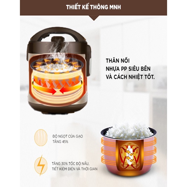 Lòng nồi dày 2.0mm nặng 580 gram bằng hợp kim nhôm sơn Ceramic chống dính dẫn nhiệt nhanh, nấu nhanh và cơm chín đều.