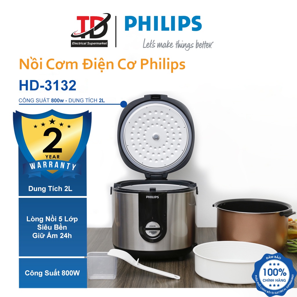 Nồi Cơm Điện Cơ Philips HD3132 - Lòng Nồi 5 Lớp - Công Suất 800W / 2Lit - Bảo Hành Chính Hãng 2 NămThông số kỹ thuật Nồi cơm điện Philips 2 lít HD3132