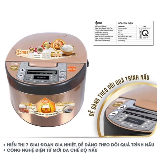 - Nồi cơm điện tử 1.8 lít Comet CM8086N8 là nồi cơm có thiết kế hiện đại với màu sắc: vàng đồng, tím mận, thể hiện sự sang trọng cho mỗi gia đình. Nồi cơm điện tử có dung tích 1.8 lít phù hợp với gia đình có 2 đến 6 người.