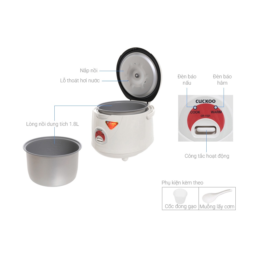 Nồi cơm Cuckoo 1.8L CR-1021Nồi cơm Cuckoo 1.8L CR-1021 được thiết kế hiện đại, kiểu dáng tinh tế, nhỏ gọn, quai xách tiện lợi, màu trắng trang nhã nổi bật các phím chức năng đỏ. Dung tích 1.8L đáp ứng nhu cầu sử dụng cho gia đình 4-6 thành viên.