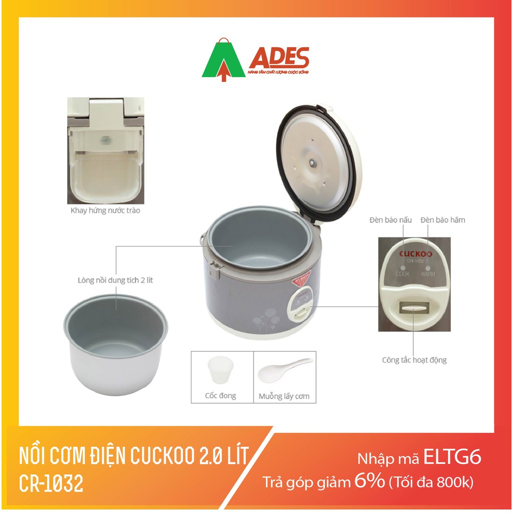 Nồi cơm điện Cuckoo CR1032 dung tích 2.0L thích hợp cho những bữa ăn của gia đình thành viên từ 4-6 thành viên. Nồi cơm điện Cuckoo CR1032 là sự lựa chọn hoàn hảo cho chị em nội trợ.