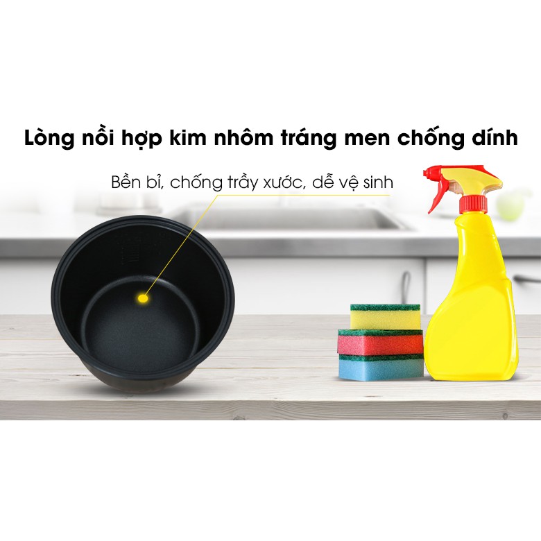 Đặc biệt, lòng nồi được làm bằng hợp kim nhôm tráng lớp chống dính cao cấp siêu bền, dễ chùi rửa và đảm bảo an toàn cho sức khỏe người dùng. Sản phẩm sử dụng cơ chế gia nhiệt 4 chiều với lớp bông thủy tinh giữ nhiệt có tác dụng làm nhiệt lượng tỏa đều và giữ lâu hơn để cơm luôn thơm ngon, nóng hổi.