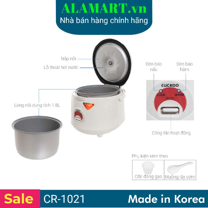 • Nồi cơm nắp gài Cuckoo CR-1021 đến từ thương hiệu gia dụng nổi tiếng hàng đầu Hàn Quốc, mẫu mã đơn giản, hiện đại, nấu cơm thơm ngon, tiện dụng.