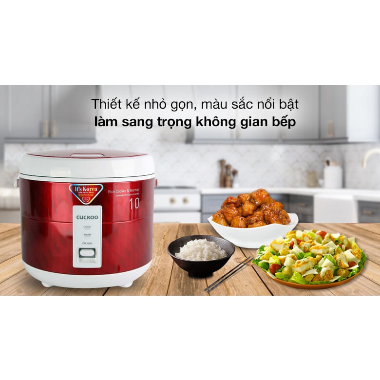 Nồi cơm điện Cuckoo có thiết kế nhỏ gọn, màu đỏ trẻ trung, họa tiết đẹp mắt, sáng bóng, làm sang trọng không gian bếp