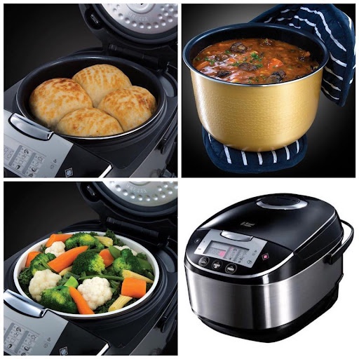 -Russell Hobbs Multicooker được đặc trưng bởi việc sử dụng vật liệu bền, dễ chăm sóc. Nấu ăn có thể được thiết lập trước 24 giờ.