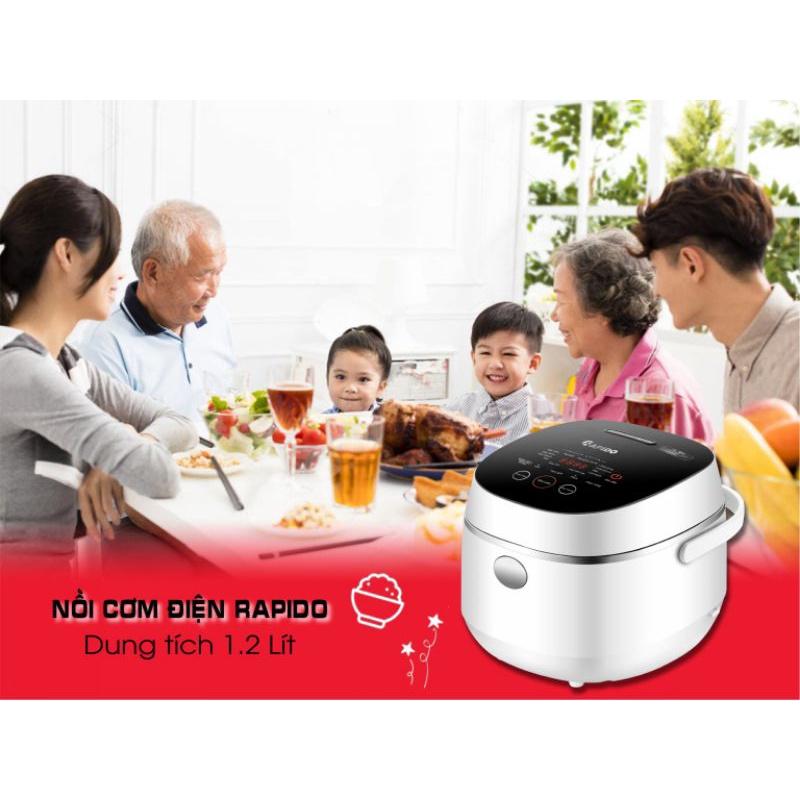Nồi cơm điện tử Rapido thiết kế sang trọng hiện đại, màn hình điện tử lớn với phím bấm cảm ứng dễ sử dụng. 10 chức năng nấu giúp người dùng có thể dễ dàng nấu nhiều món ăn chỉ với 1 động tác đơn giản giúp tiết kiệm thời gian. Công nghệ Fuzzy Nhật Bản giúp gia nhiệt tuần hoàn, tỏa nhiệt đa chiều 360 độ, kiểm soát nhiệt độ chính xác, giúp giữ trọn vị ngon của món ăn. Đồng thời, van thoát hơi thông minh làm cho lượng nước được thoát ra ngoài một cách hợp lý nhất, nhưng vẫn giữ lại được các vitamin và dưỡng chất có lợi cho cơ thể. Dung tích 1.2L phù hợp với gia đình 2-4 người
