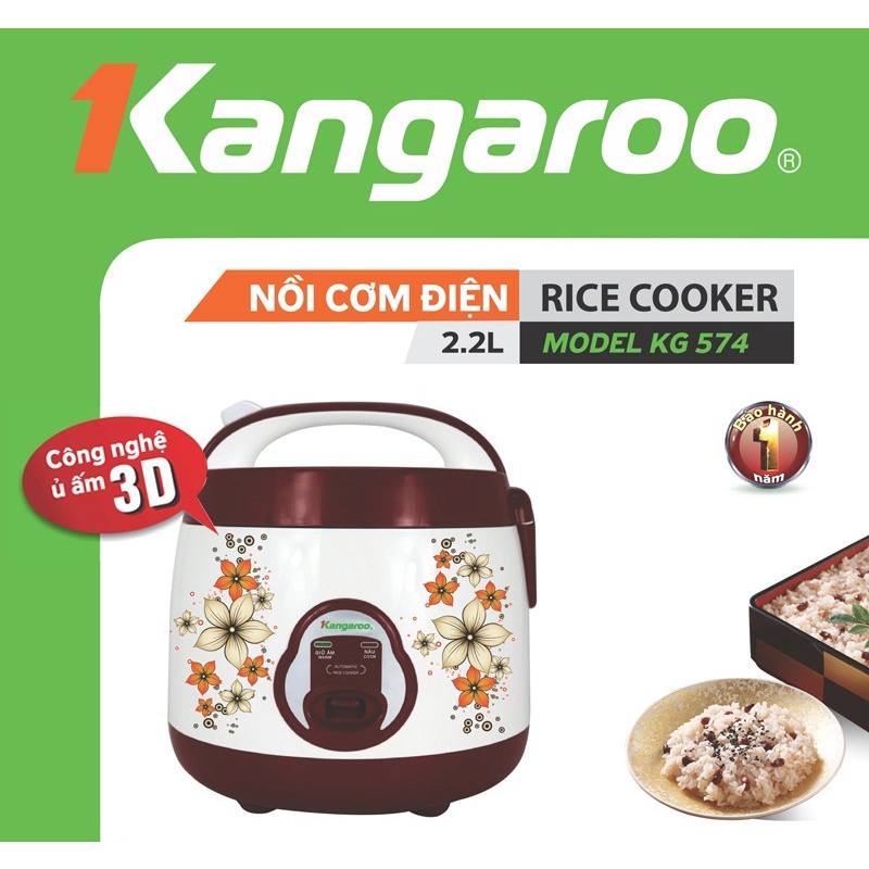 Nồi cơm điện Kangaroo KG574 công nghệ ủ ẩm 3D thế hệ mới, công nghệ nấu cơm nhanh bằng mâm nhiệt phẳng kết hợp công suất và dung tích lớn để đáp ứng nhu cầu sử dụng của người tiêu dùng.Nồi cơm điện Kangaroo KG574