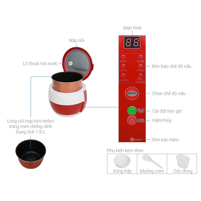 Nồi cơm điện Kangaroo KG835 có dung tích 1.8L, đảm bảo đáp ứng nhu cầu của gia đình có từ 2-4 thành viên.