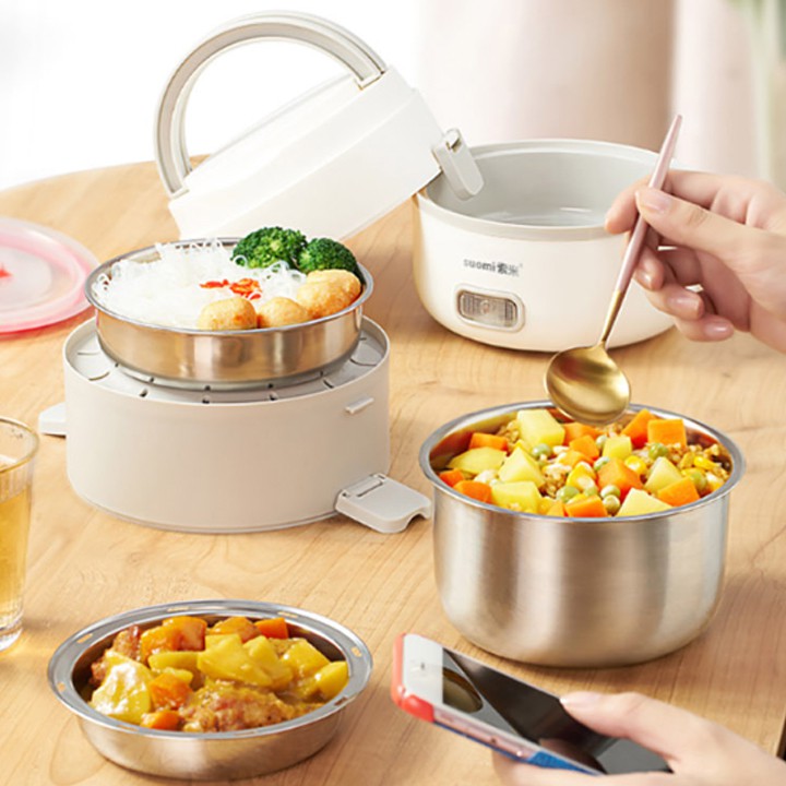 Nồi cơm điện mini 3 ngăn inox, nấu cơm, các món hấp, sử dụng hâm cơm văn phòng, đi làm