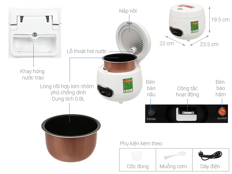 Nồi Cơm Điện Cao Cấp 0.8 Lít với những chức năng như: nấu, hấp, luộc, giữ ấm thì bữa ăn của bạn cũng trở nên ngon hơn, an toàn hơn, vệ sinh hơn. Kiểu dáng nhỏ gọn, thiết kế nhỏ gọn giúp không gian sống của bạn độc đáo hơn.Chi tiết nồi cơm điện cao cấp