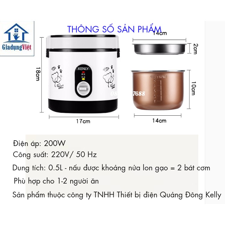 Nồi cơm mini KENLY - 0.5 L nấu cơm hâm nóng nấu cháo hầm xương có lồng nồi tháo rời, chống dính 5 lớp đảm bảo cơm không bị dính nồi, không có cháy và không bị bong lớp chống dính khi sử dụng lâu.