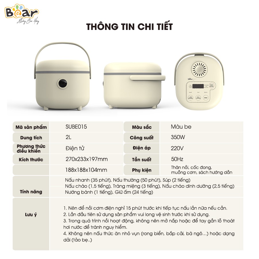 Giới thiệu Nồi cơm điện mini thông minh Bear SUBE015 DFB-B20A1_Bản Quốc tế_Bảo hành 18 tháng. Nồi cơm điện mini 2L tiện lợi HAGU.