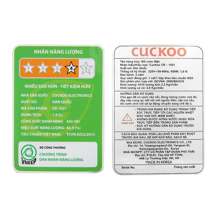 Nồi Cơm Điện Nắp Gài Cuckoo CR-1021 dung tích 1.8L Hàn Quốc