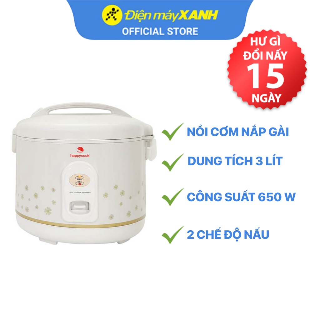 Thiết Bị Điện Gia Dụng > Đồ gia dụng nhà bếp > Nồi cơm điện || Nồi cơm điện nắp gài Happycook HC-300 3 lít 650 W lòng nồi chống dính - Chính hãng BH 24 tháng - Sản xuất tại IndonesiaCòn hàng
